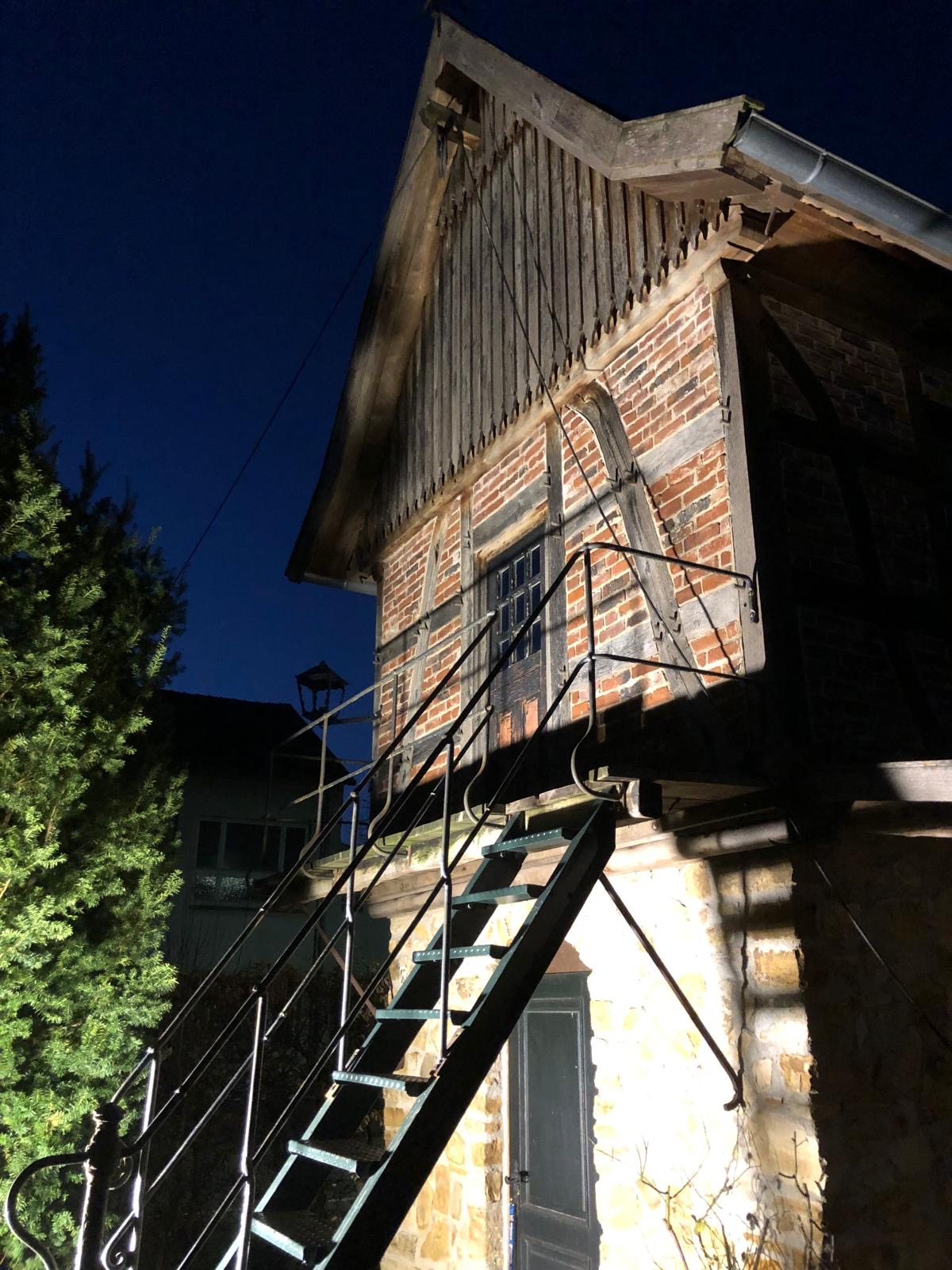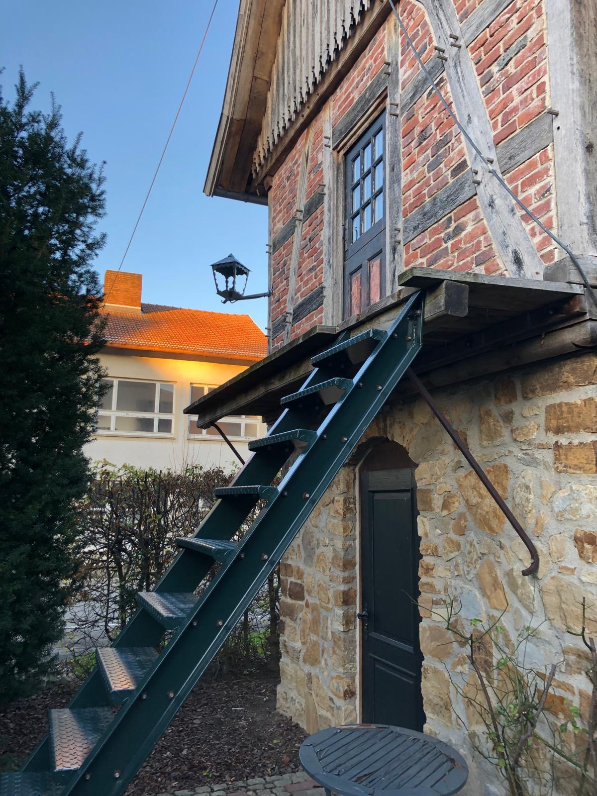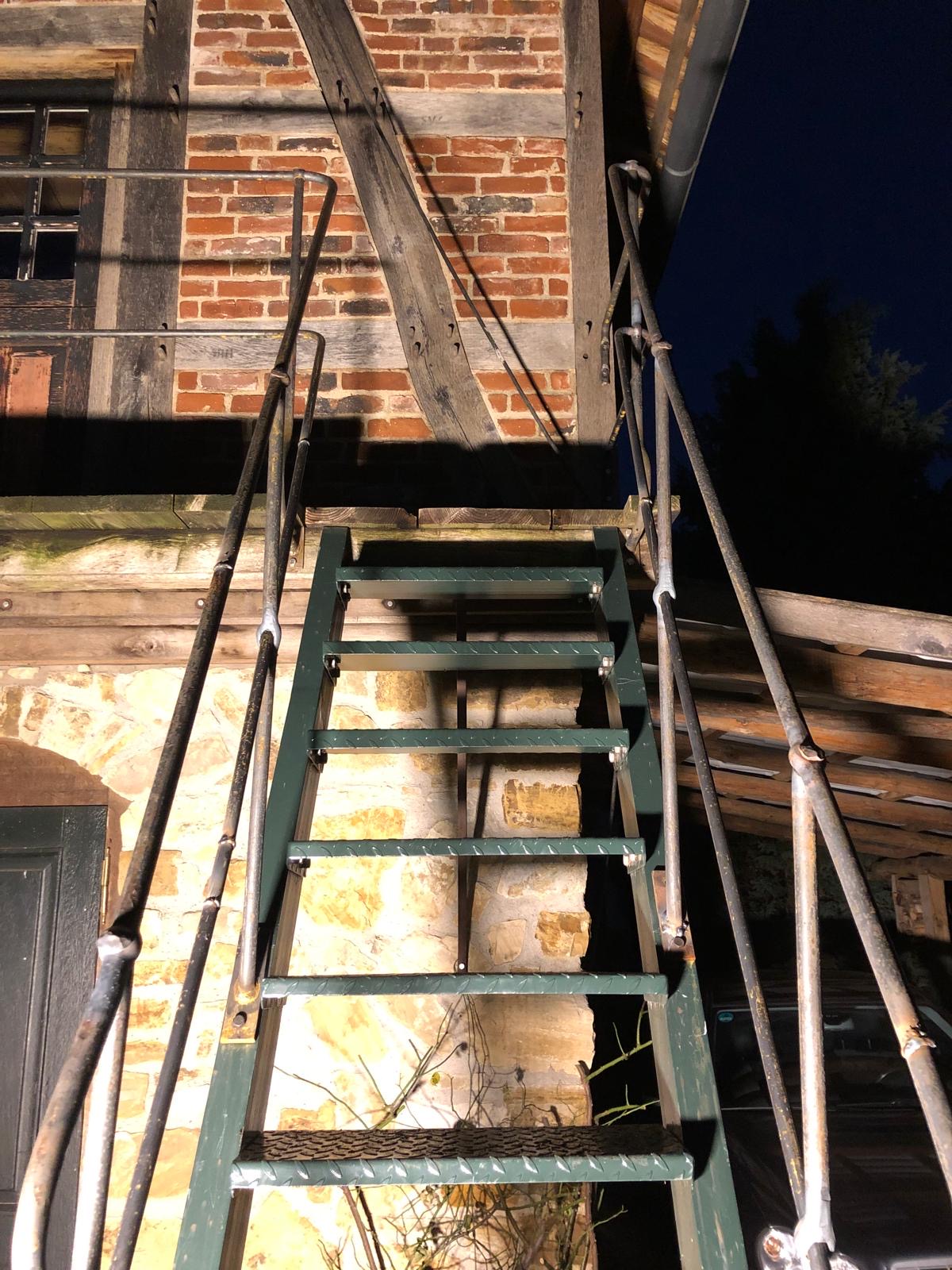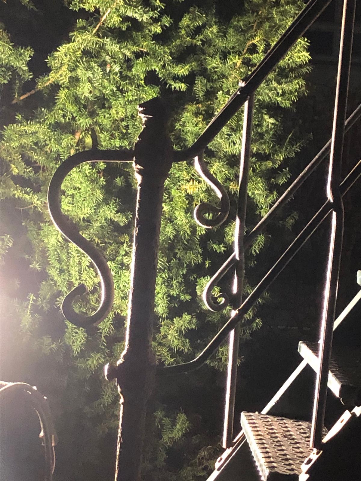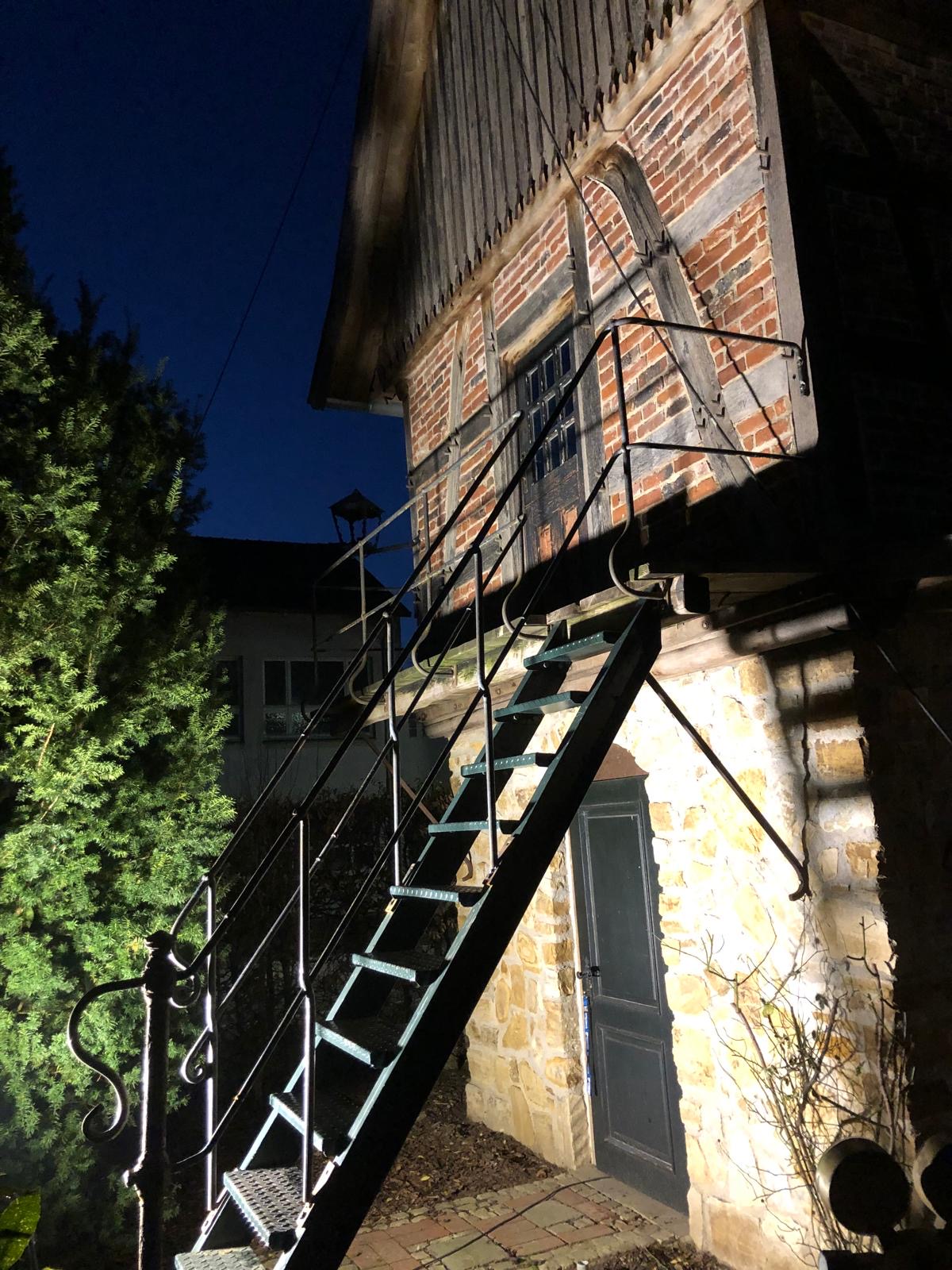 Ein aus Rundstahl gefertigtes Geländer, in dem ich traditionelle Techniken für die Verbindungen gewählt habe. Die Pfosten sind mit dem Handlauf vernietet. Der Kniegurt läuft durch eine Lochung im Pfosten. Dazu kommt, dass wir eine gusseiserne Säule als letzten Geländerpfosten am Antritt integriert haben. Eine schöne Arbeit, die passend zu dem Bauwerk ist.