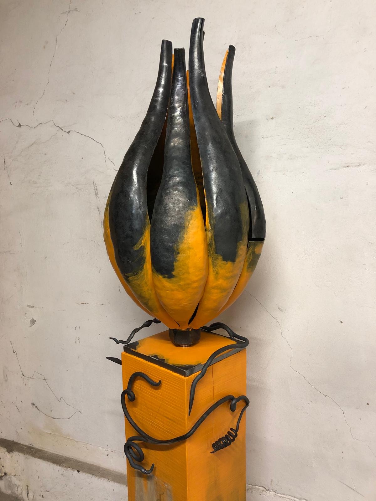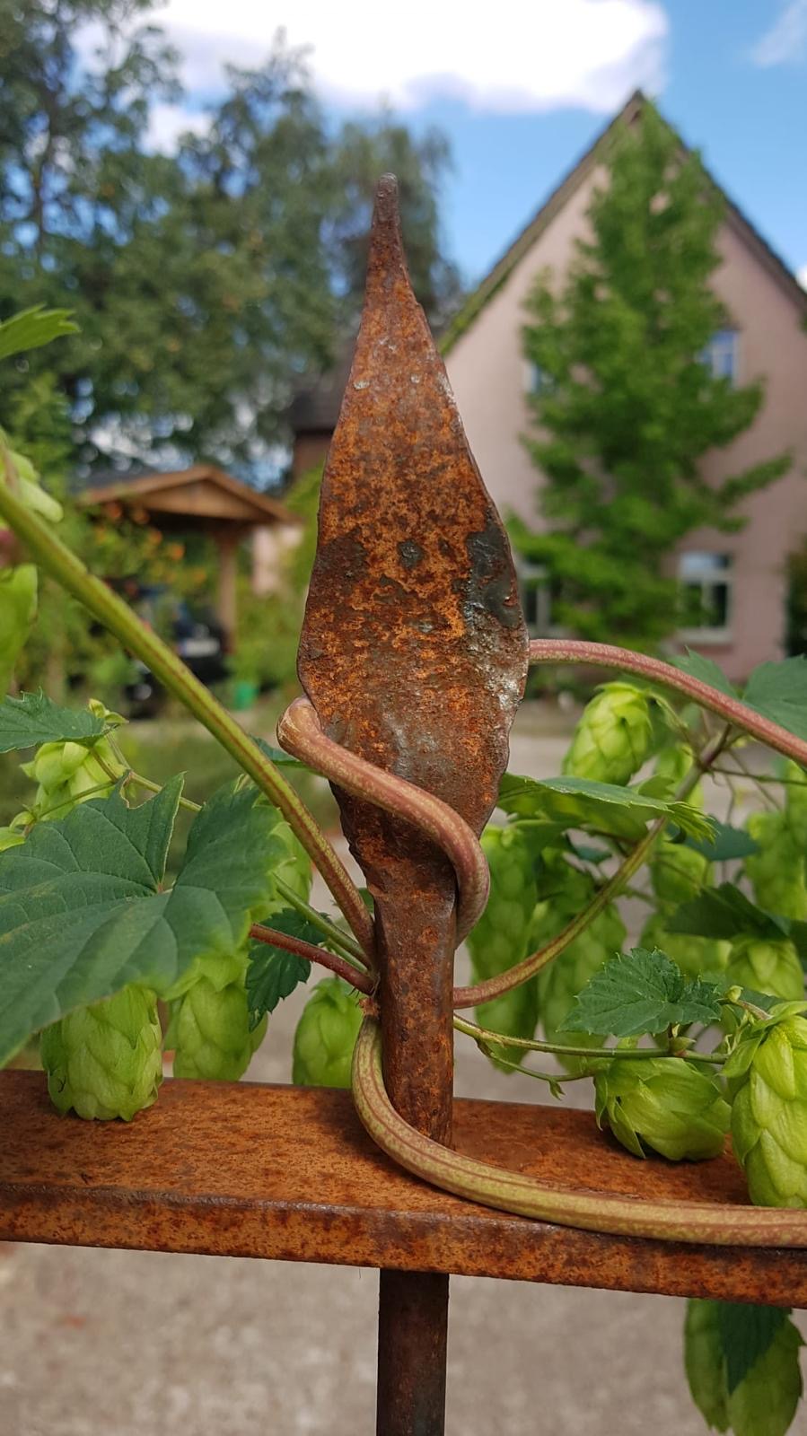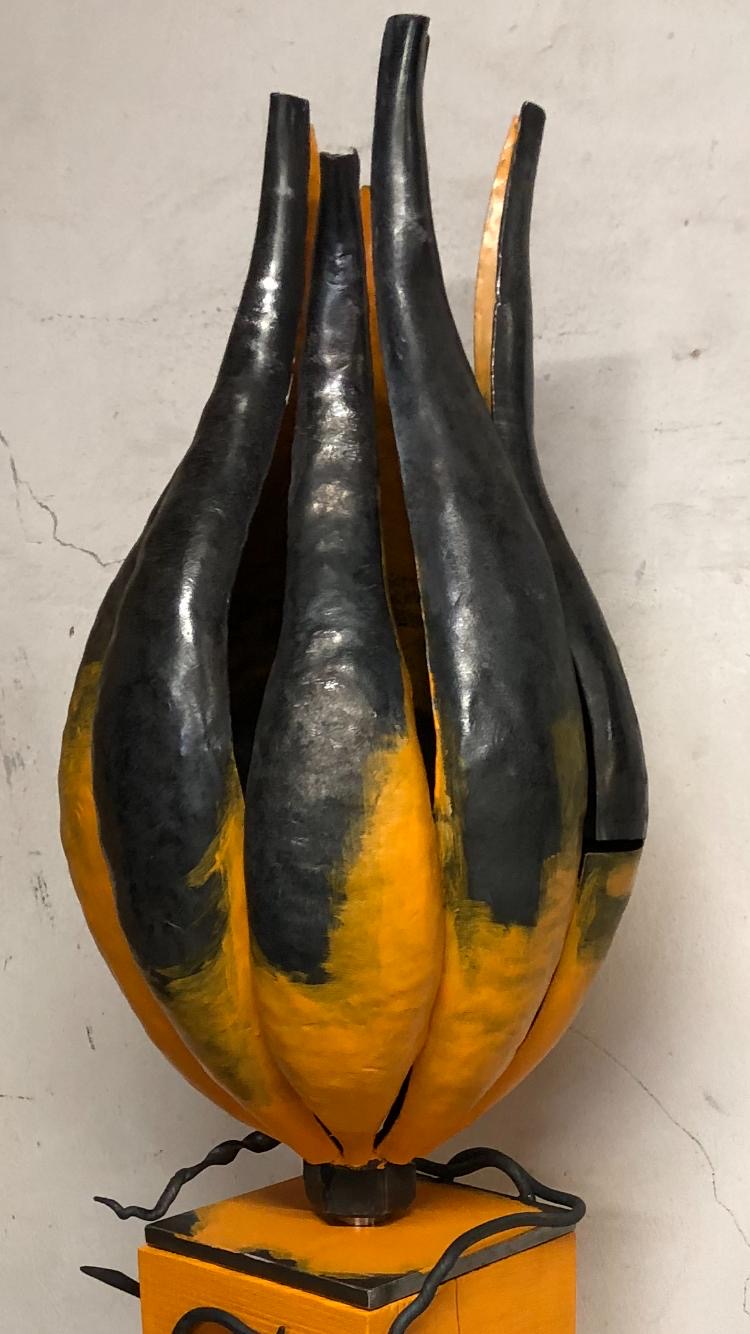 Einzelne Bleche, die ich in der Schmiede erhitzt und mit dem Hammer in Form gedengelt habe. Die Ranken sind aus Rundeisen gefertigt. Das Ganze steht auf einem massiven Eichensockel. Für mehr Kontrast habe ich mit der orangenen Farbe eine tolle Wirkung erzielt. Der Kürbis ist dort, wo keine Farbe drauf ist, mit Klarlack überzogen und dadurch witterungsbeständig.