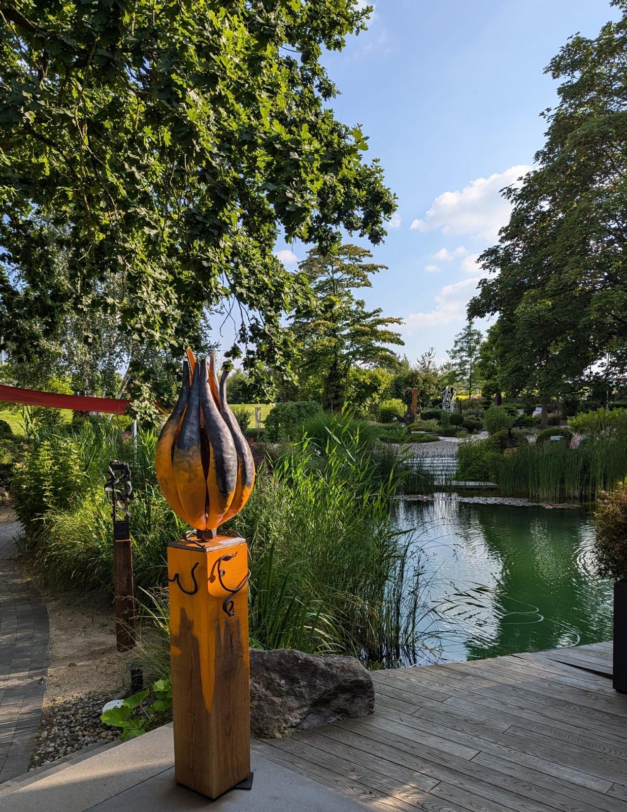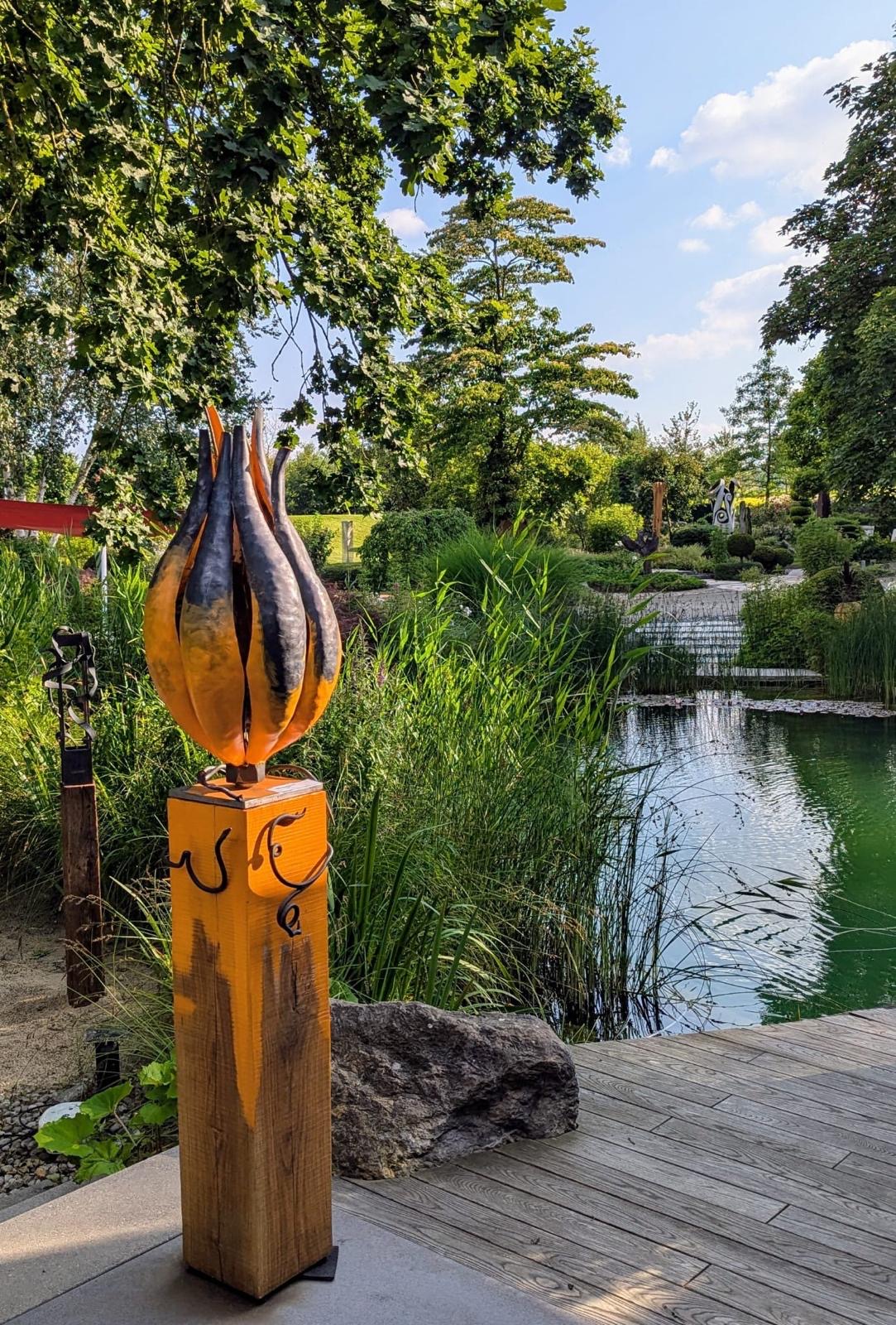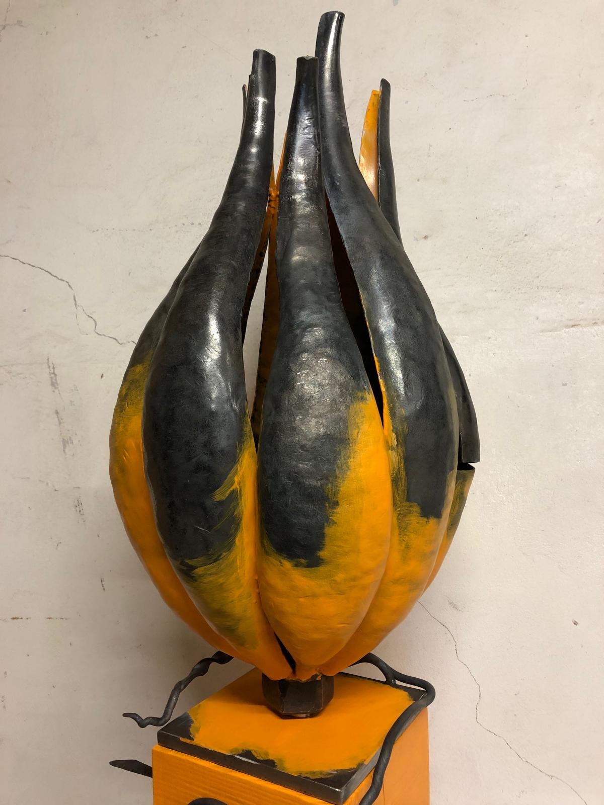 Einzelne Bleche, die ich in der Schmiede erhitzt und mit dem Hammer in Form gedengelt habe. Die Ranken sind aus Rundeisen gefertigt. Das Ganze steht auf einem massiven Eichensockel. Für mehr Kontrast habe ich mit der orangenen Farbe eine tolle Wirkung erzielt. Der Kürbis ist dort, wo keine Farbe drauf ist, mit Klarlack überzogen und dadurch witterungsbeständig.